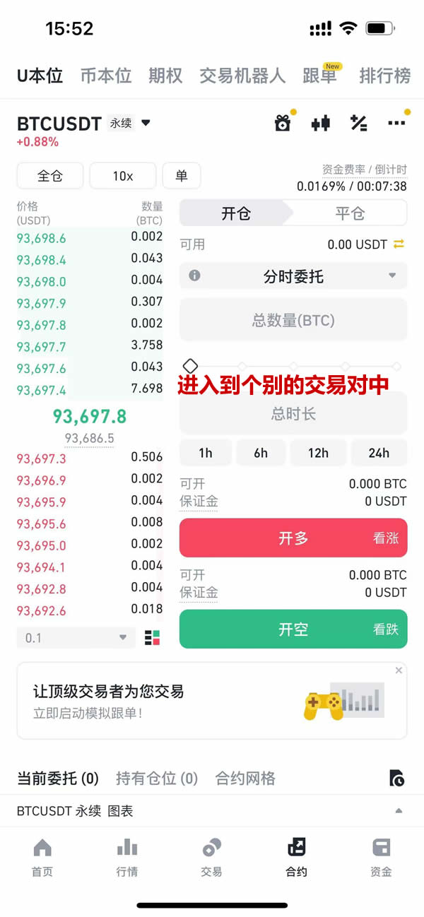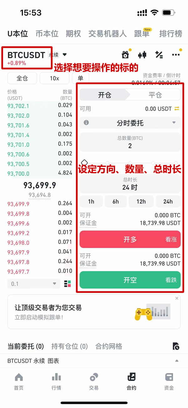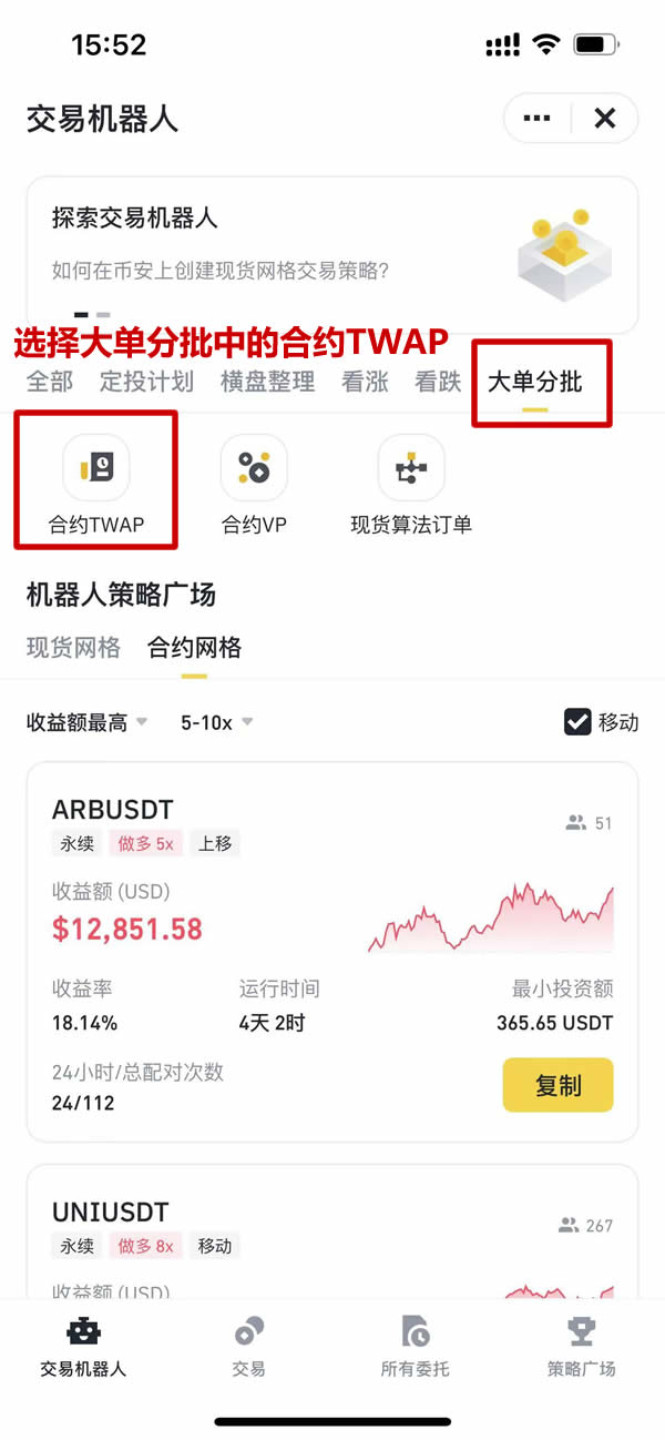 在「大单分批」菜单下激活「合约TWAP」模块。