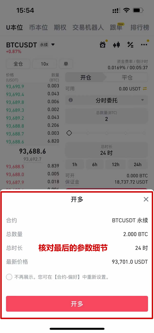 仔细核对参数后完成下单,系统将自动执行拆分交易,用户可在订单历史中查看详细执行记录。