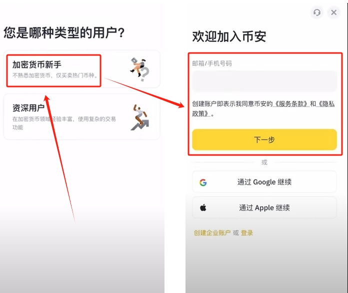 这里问您是哪种类型的用户,有加密货币新手和资深用户。如果你选择加密货币新手,就会弹出注册的页面。如果你有账号就不需要再注册了,我们把他关了,然后你就可以进行直接登录了。