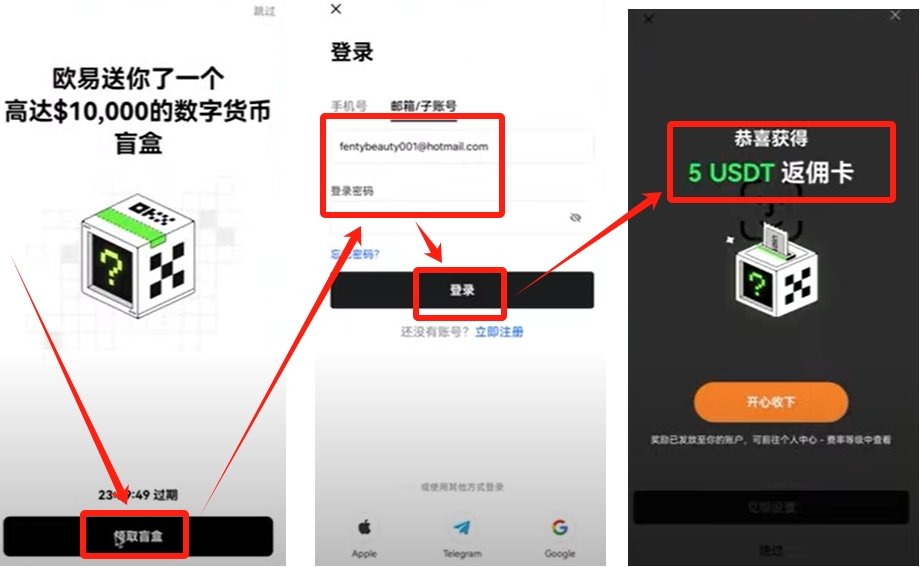 2.安装好之后我们打开APP。系统会送给你 一个盲盒,我们登录刚才注册的账户,显示我这里领到了5U的返佣卡。