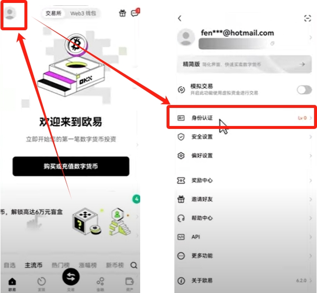 3.接下来开始账户认证。点击左上角的头像,选择“身份认证”。