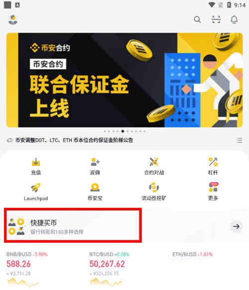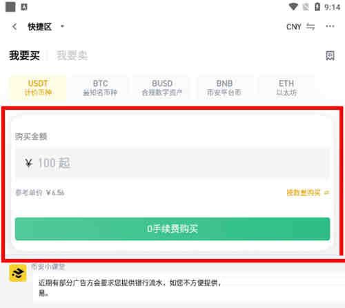 4、通过首页"快捷买币"购买USDT(平台通用代币),注意不能直接使用发比交易。