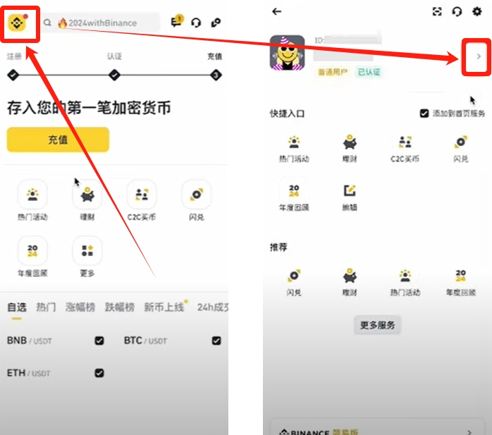 审核通过后这里就会出现一个【充值】按钮,我们先不充值,先去做一些必要的安全设置。点击左上角的币安图标,再点击向右的箭头。