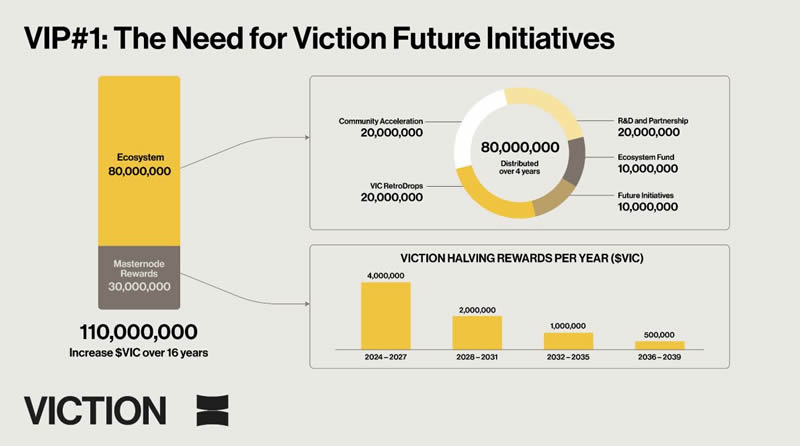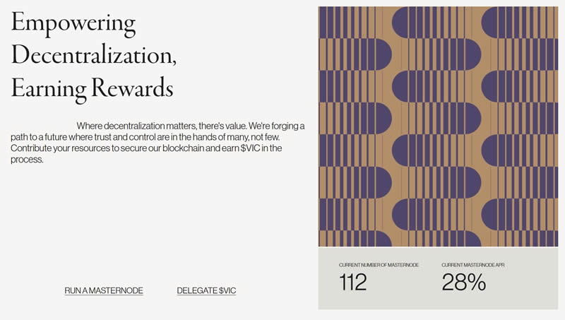 作为平台原生代币,VIC驱动交易、质押与治理功能,总量恒定为2.1亿枚。初始流通量5500万枚中,1200万枚分四年解锁给团队,1600万枚用于生态建设。2024年硬分叉新增1.1亿枚,其中3000万枚用于主节点奖励。持有者通过质押参与治理,前150名主节点候选人可获得验证权,奖励按基础设施(40%)、质押(50%)和基金会(10%)分配,形成去中心化治理闭环。