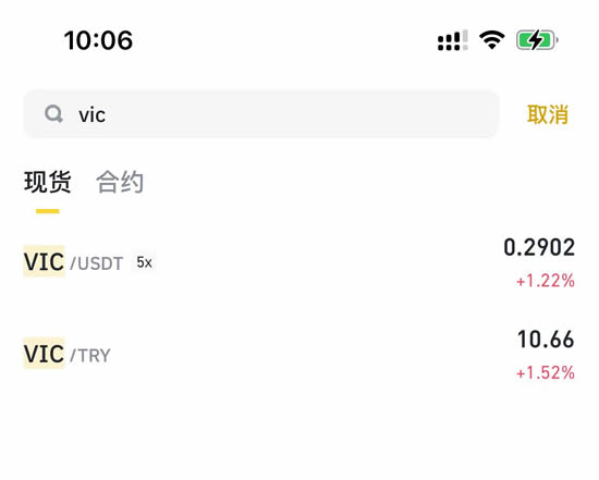 2、在搜索框输入VIC,系统将自动显示交易对,选择【VIC/USDT】进入交易页面;