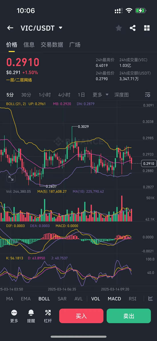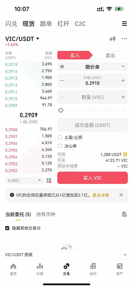 4、选择【限价单】模式,依次设置价格、数量等参数,确认无误后点击【买入VIC】完成交易。