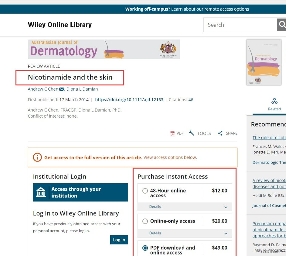 四、谷歌学术下载不了的文献解决办法,例如这篇收费文献“Nicotinamide and the skin”从谷歌学术打开文献来源链接,看到该文献收费昂贵: