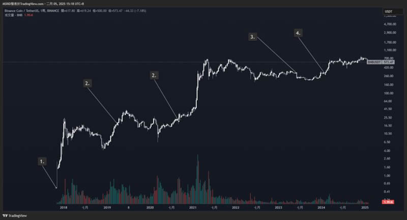 BNB最初作为以太坊ERC-20代币诞生,后迁移至自主开发的币安链与币安智能链。2017年ICO时以0.11美元单价募集1500万美元,现总供应量锁定2亿枚,通过季度销毁机制持续减少流通量。