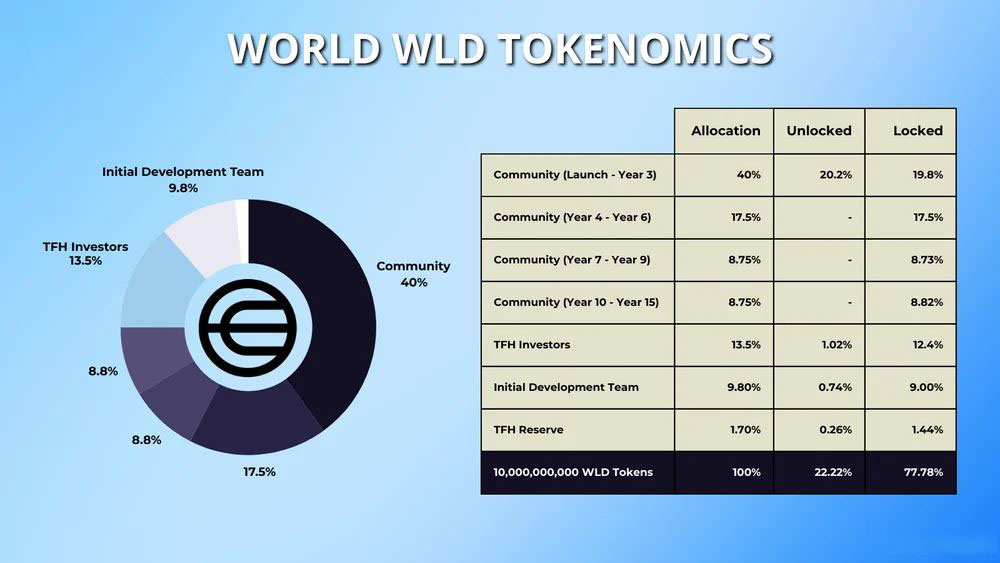 WLD代币总量100亿枚,当前流通量22.2%,采用分级释放机制: