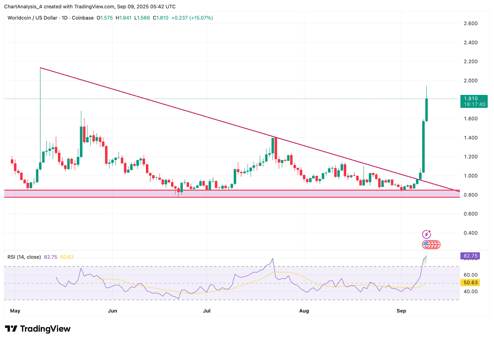 WLD近期突破1.81美元阻力位,RSI指标显示超买但仍有上行空间。技术分析显示: