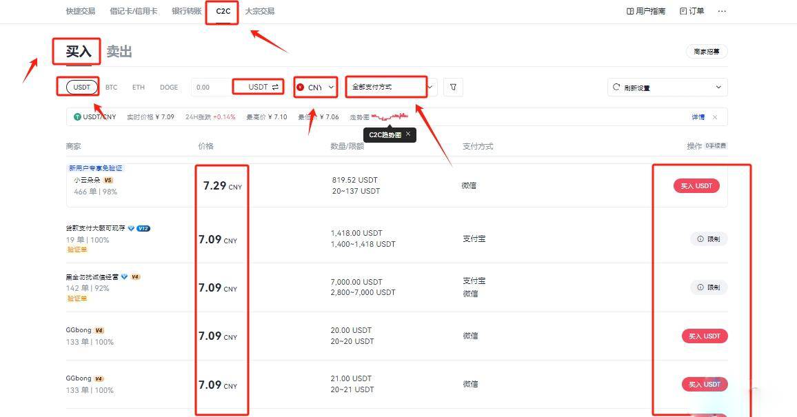 4.通过认证后,导航至"买币-法定货币交易"界面,优先购买USDT作为交易媒介