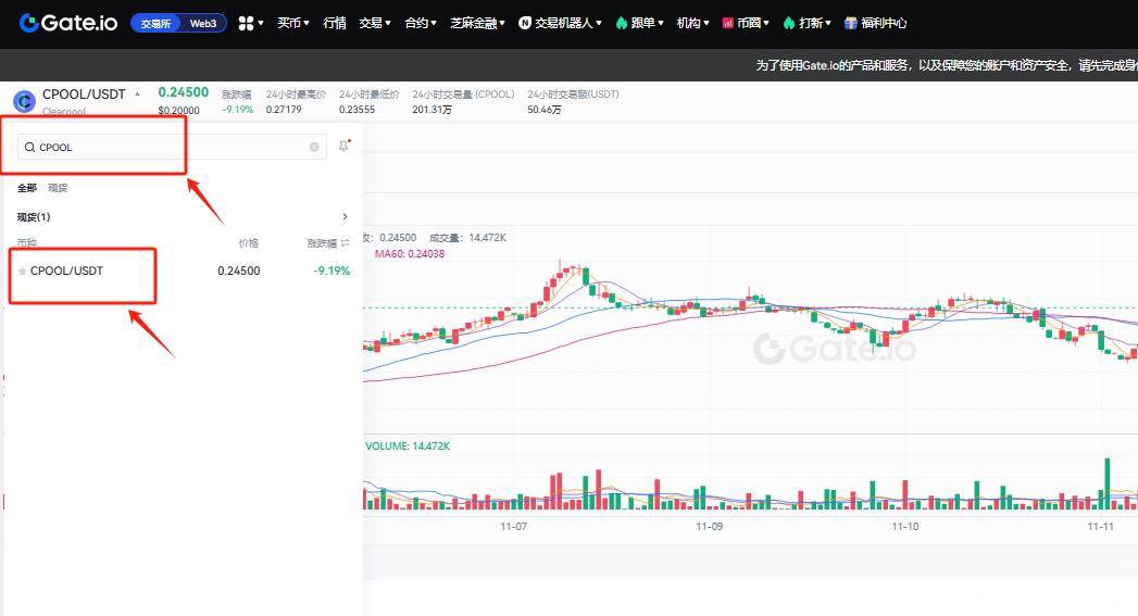 6.搜索框中输入CPOOL,选择CPOOL/USDT交易对查看实时行情数据