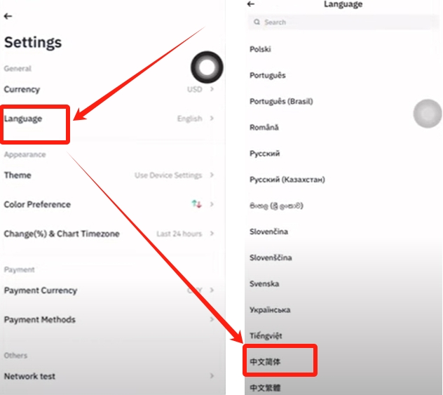 在这里可以先设置一下中文页面。点击右上角的×,关闭当前的页面进入到首页,点击左上角的币安图标,点击右上角的齿轮。