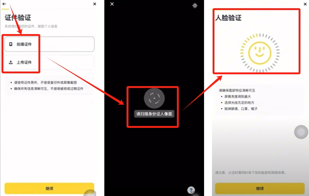 验证选拍摄或者是上传都行,然后扫描一下身份件的正反面,接着需要进行一下人脸识别的验证,包括张张嘴、眨眨眼、左右摇头等操作。