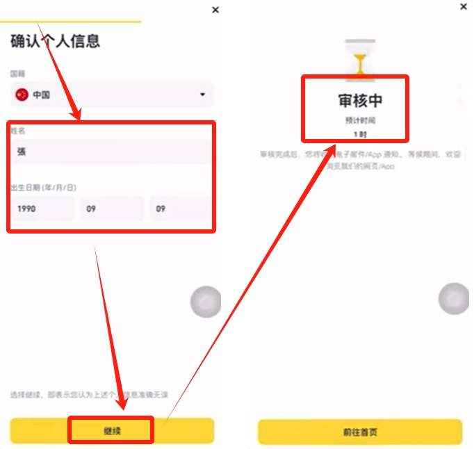 最后我们再确认一下信息,这里大家一定要如实的填写真实的信息,要跟身份件上保持一致。填好之后,点击【继续】就完成了。一般正常等待几分钟审核就可以全部通过了。
