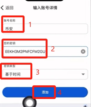 第一栏我们可以备注一下名称,第二栏粘贴刚才从币安复制的16位密钥,第三栏默认就可以,再点击【添加】,这样就保存好了。