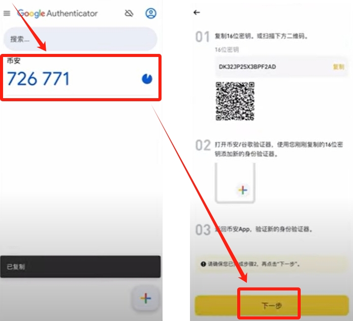 我们可以看到这里出现了一个 6位数的币安验证码,类似于我们手机上收到的验证码,只是这个验证码只保存在APP当中,我们要在计时图标结束之前,回到币安区 验证。如果这个时间比较短了,我们可以等待新的验证码出现,再及时区点击这个验证码,他会自动复制。然后切回币安APP,点击【下一步】。