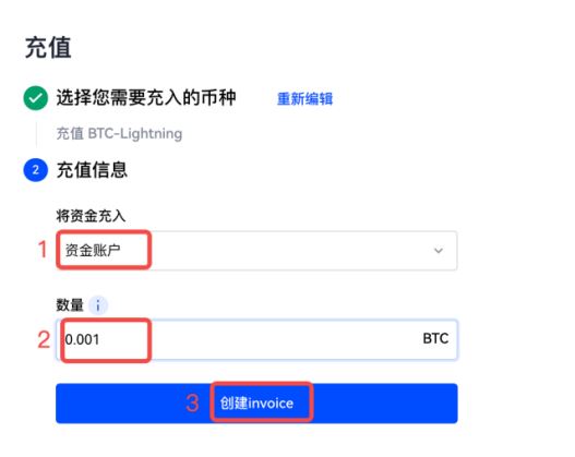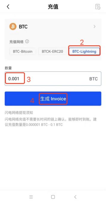 2、选择币种BTC及【BTC-Lightning】网络,输入0.000001-0.1 BTC区间内的充值金额,点击【生成Invoice】。