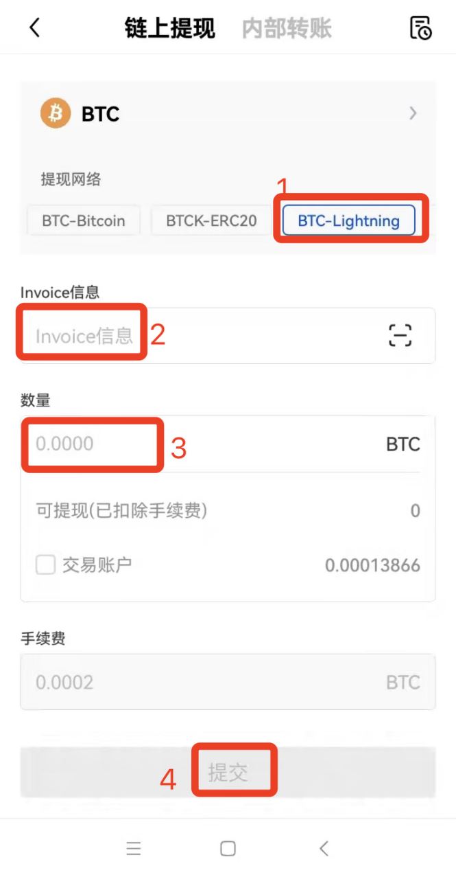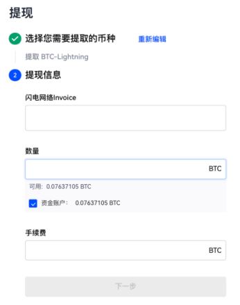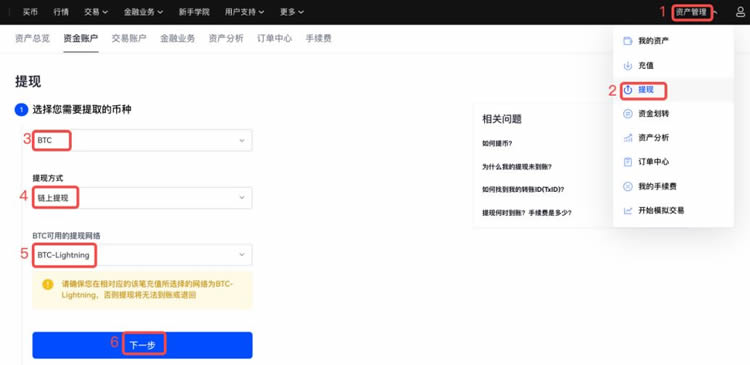 1、通过官网【资产管理】-【提现】选择BTC币种及【BTC-Lightning】网络。