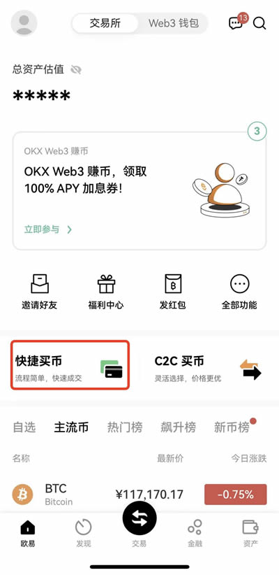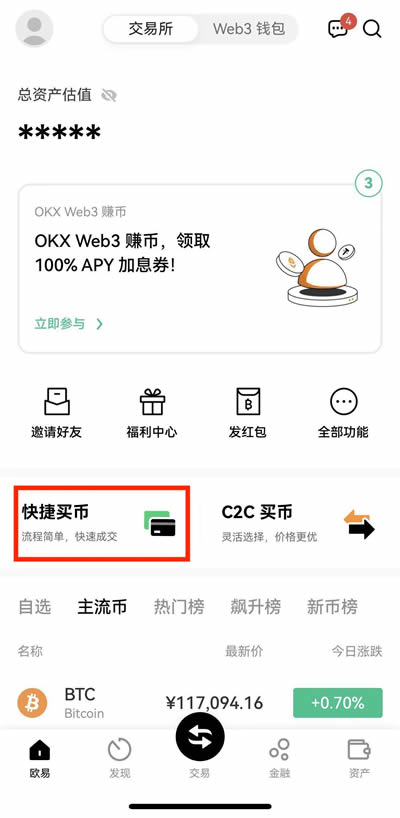 首页点击【快捷买币】,输入金额后选择支付方式完成购买。
