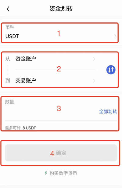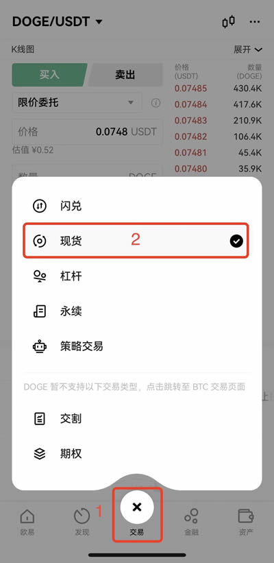通过资金划转后,在交易区选择币对完成买卖操作。