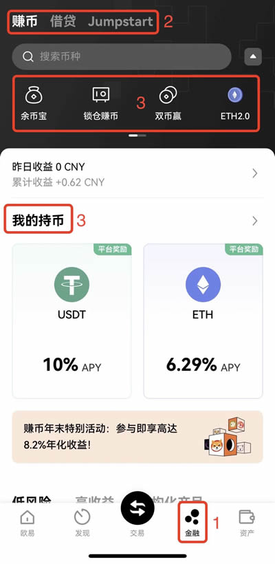 平台提供赚币、借款等理财产品,用户可根据需求选择参与。