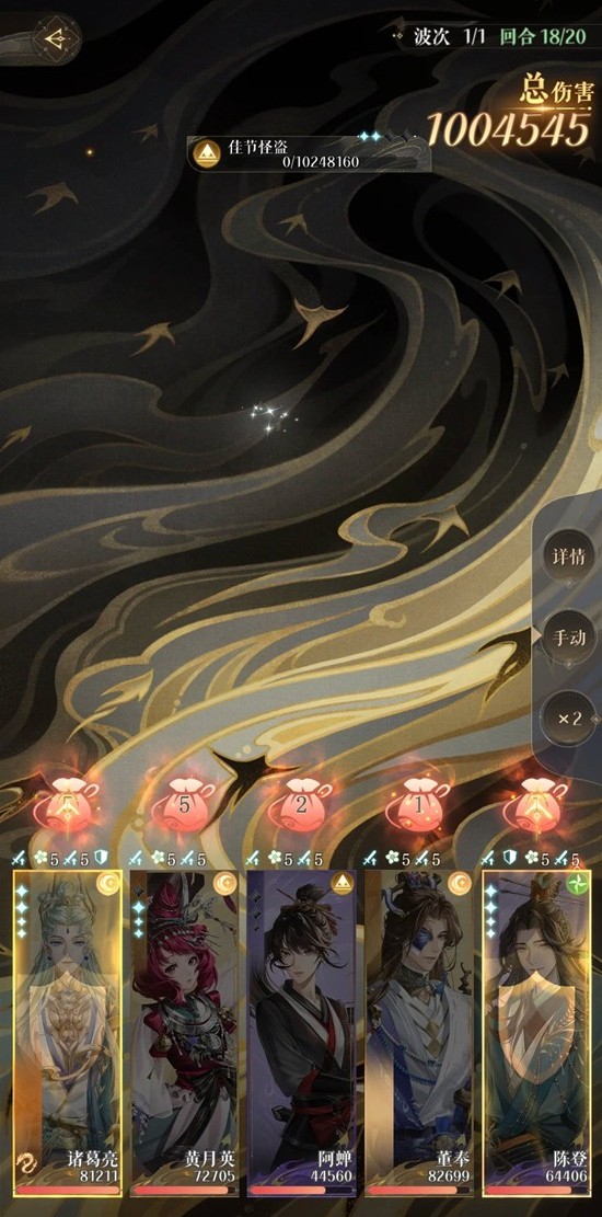 因为我的诸葛亮三星,其实不太好控制域,只要懂机制其实可以灵活一点,没有生存问题,阿婵和陈登都可以换其他密探,有时间我再试试优化(图是我优化过的,14回合选择先打1号,先打死1号,其他回合行动顺序也有些改动)