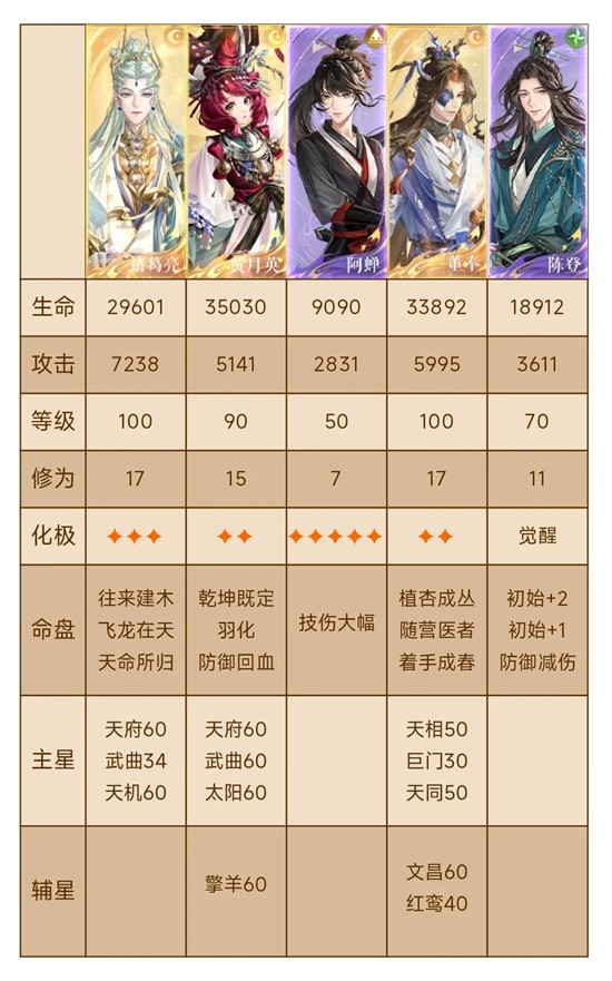 优点:适合没有张闿和满宠的dot队,只上场3种属性密探不用赌,全程无密探退场。