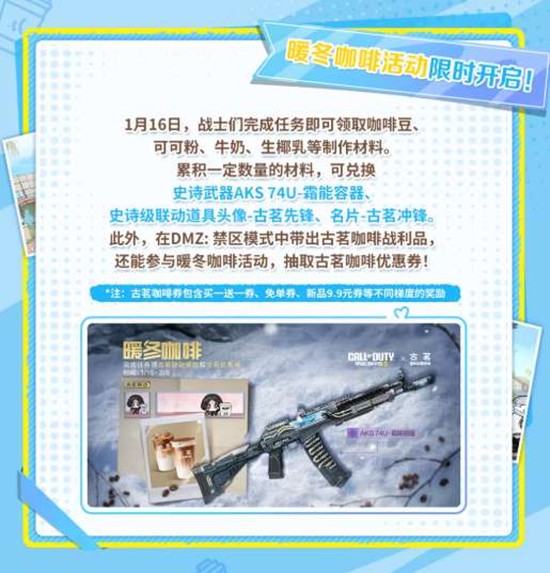 1月16日5:00起,每日登录、淘汰对手、在禁区带出咖啡各掉落咖啡豆、可可粉、牛奶或生椰乳,集齐指定数量可兑换史诗级武器AKS 74U-霜能容器,冰雾曳光配冷萃气泡换弹特效,额外材料还能换头像-古茗先锋、名片-古茗冲锋,联动收藏一次打包。