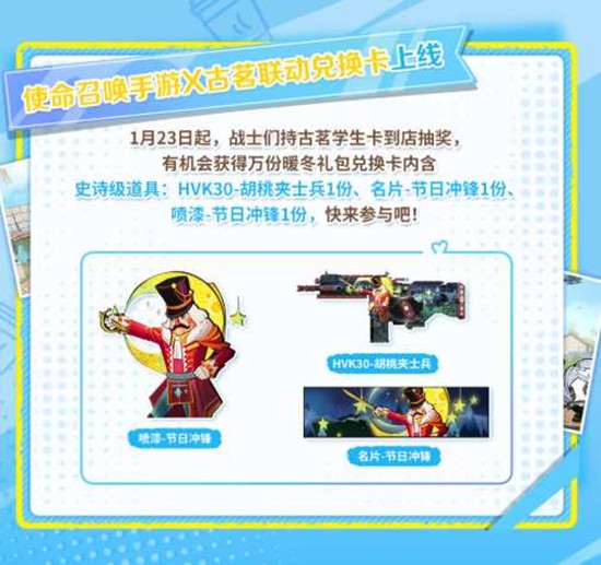 1月23日至2月8日,持古茗学生证到店核销,即可抽暖冬礼包兑换卡,万份先到先得,内含史诗级HVK30-胡桃夹士兵、名片-节日冲锋、喷漆-节日冲锋,游戏内直接兑换,军械库再添一员猛将。