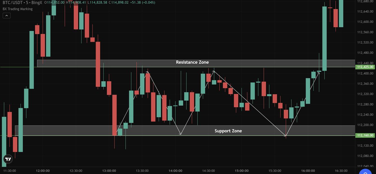 在上面的图表中,BTC/USDT在5分钟时间框架上在112,160美元(支撑)和112,440美元(阻力)之间交易。剥头皮交易者可能在112,160美元附近的支撑做多,止损设在112,120美元,风险40美元,目标设在112,440美元附近的阻力,潜在收益280美元。