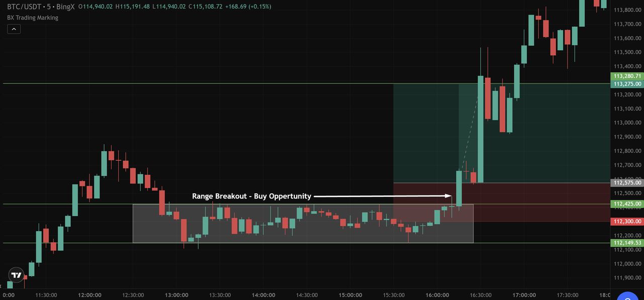 在上面的图表中,BTC/USDT在5分钟时间框架上一直在112,150美元的支撑和112,425美元附近的阻力之间整理。当价格以强劲的绿色蜡烛图突破阻力时,这发出了买入机会的信号。剥头皮交易者可以在112,425美元附近的突破点进入,并将止损设在112,300美元区间下方以控制风险。