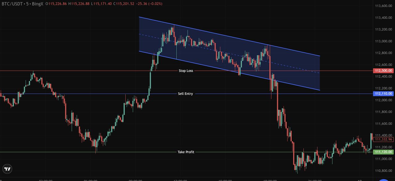 在第一个图表中,BTC/USDT形成了一个下降信道。剥头皮交易者可以在112,500美元附近的上边界做空,将止损设在阻力上方,目标设在111,120美元附近的下边界。
