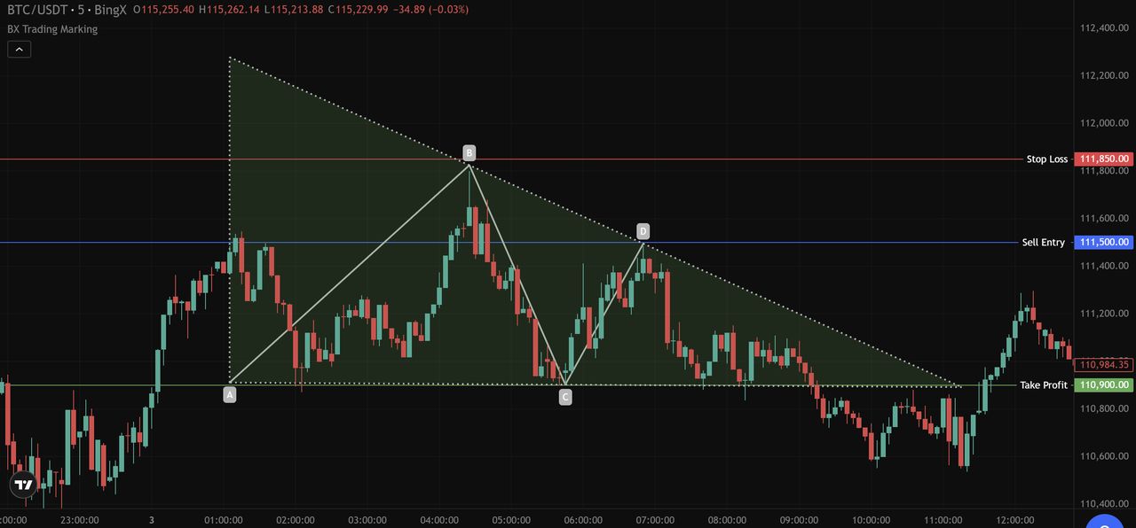 在第二个图表中,BTC/USDT显示了一个下降三角形形态。在111,500美元卖出进入,止损设在111,850美元上方,止盈设在110,900美元附近,将创造一个可管理的设置。三角形形态为交易计划提供明确水平,帮助剥头皮交易者避免猜测。