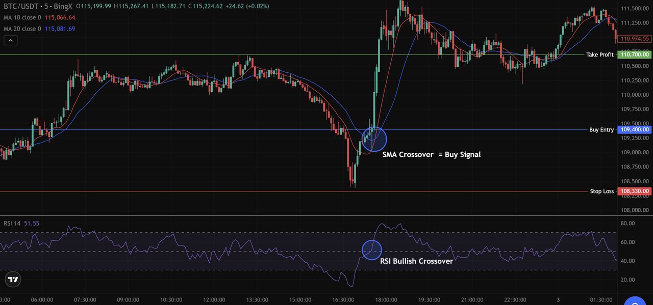 在上面的图表中,BTC/USDT显示了RSI看涨交叉(RSI从超卖水平上升至30以上),同时短期移动平均在线穿长期移动平均线。这个双重信号标志着在109,400美元的买入进入。