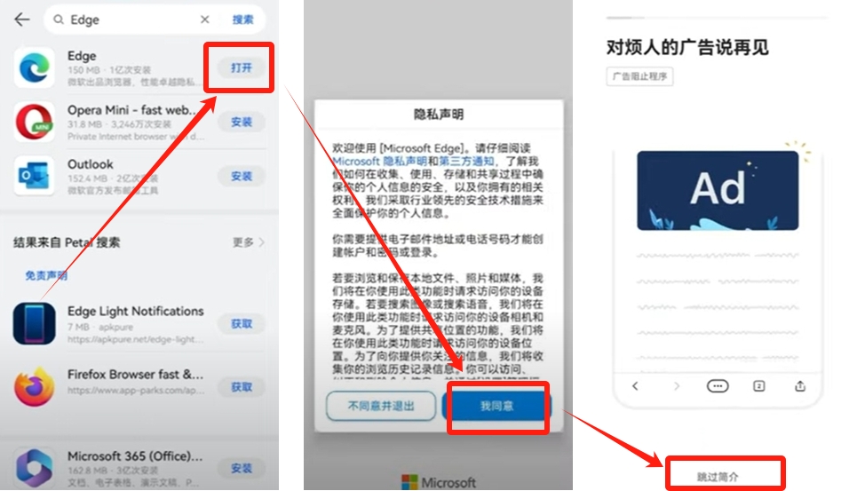 安卓用户需先在应用商店下载EDGE浏览器,选择安装量超1亿次的官方版本进行安装。
