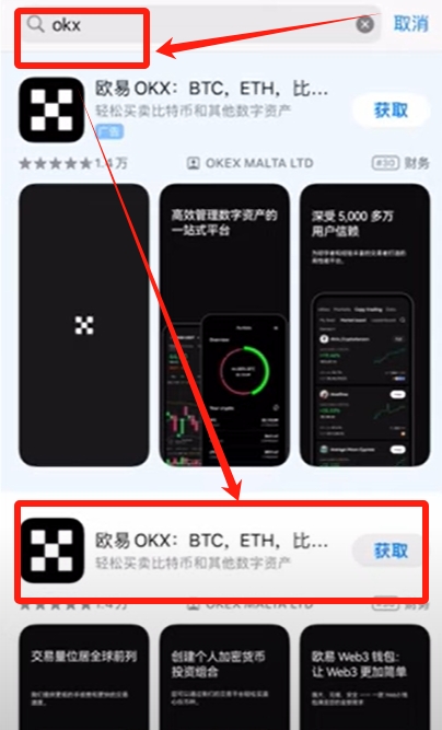 登录海外账号后搜索OKX应用,点击获取按钮即可完成下载安装。