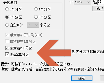3、弹出的快速分区对话框中,勾选“ESP分区”和“MSR分区”选项。
