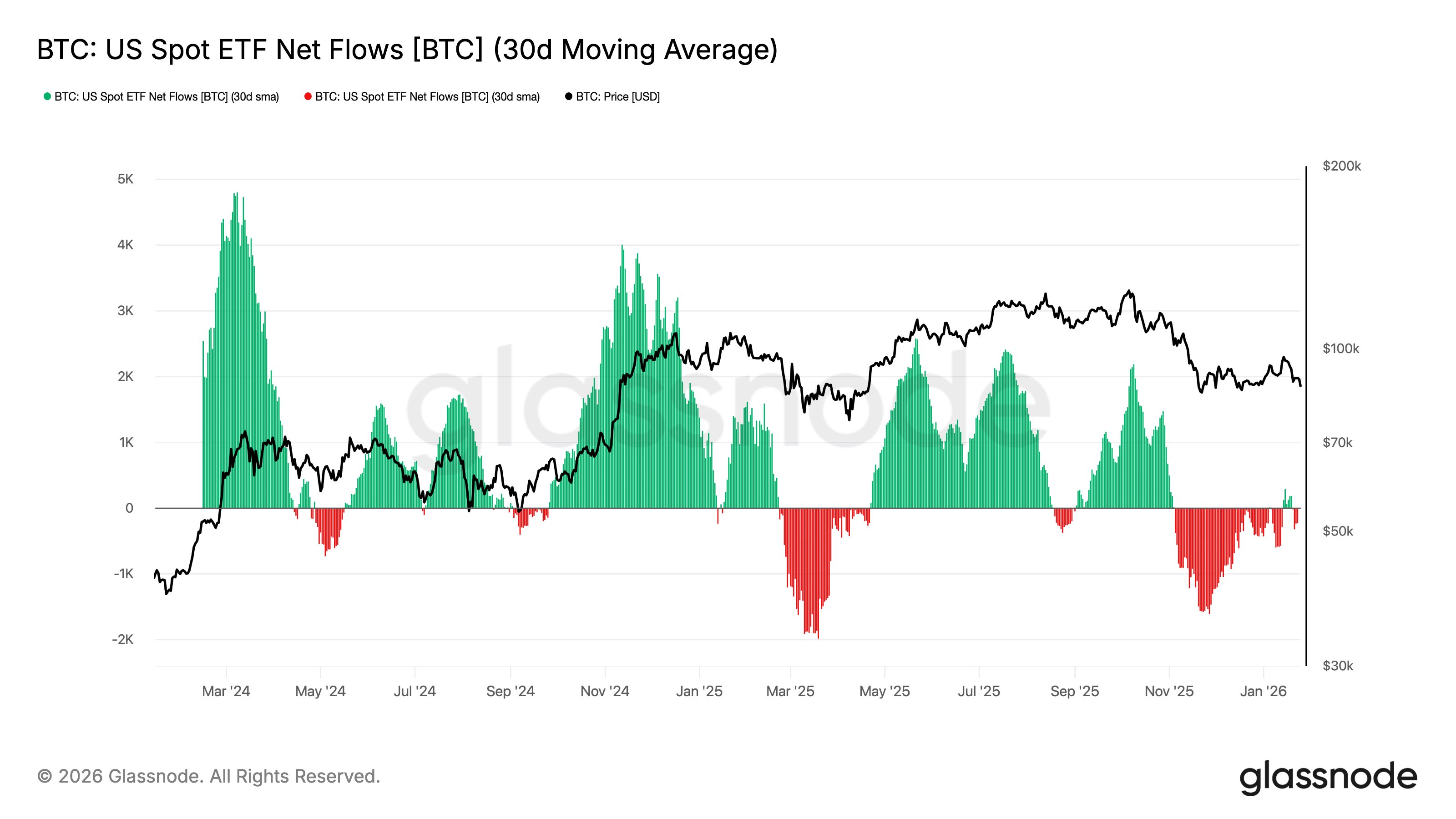 链上分析公司Glassnode在X平台最新发文中指出,近期比特币和以太坊现货交易所交易基金(ETF)的平均净流入均保持负值。现货ETF是让投资者间接持有标的资产的投资工具。就加密货币而言,这意味着交易者无需直接操作区块链基础设施,而是由基金代为购买和托管代币。