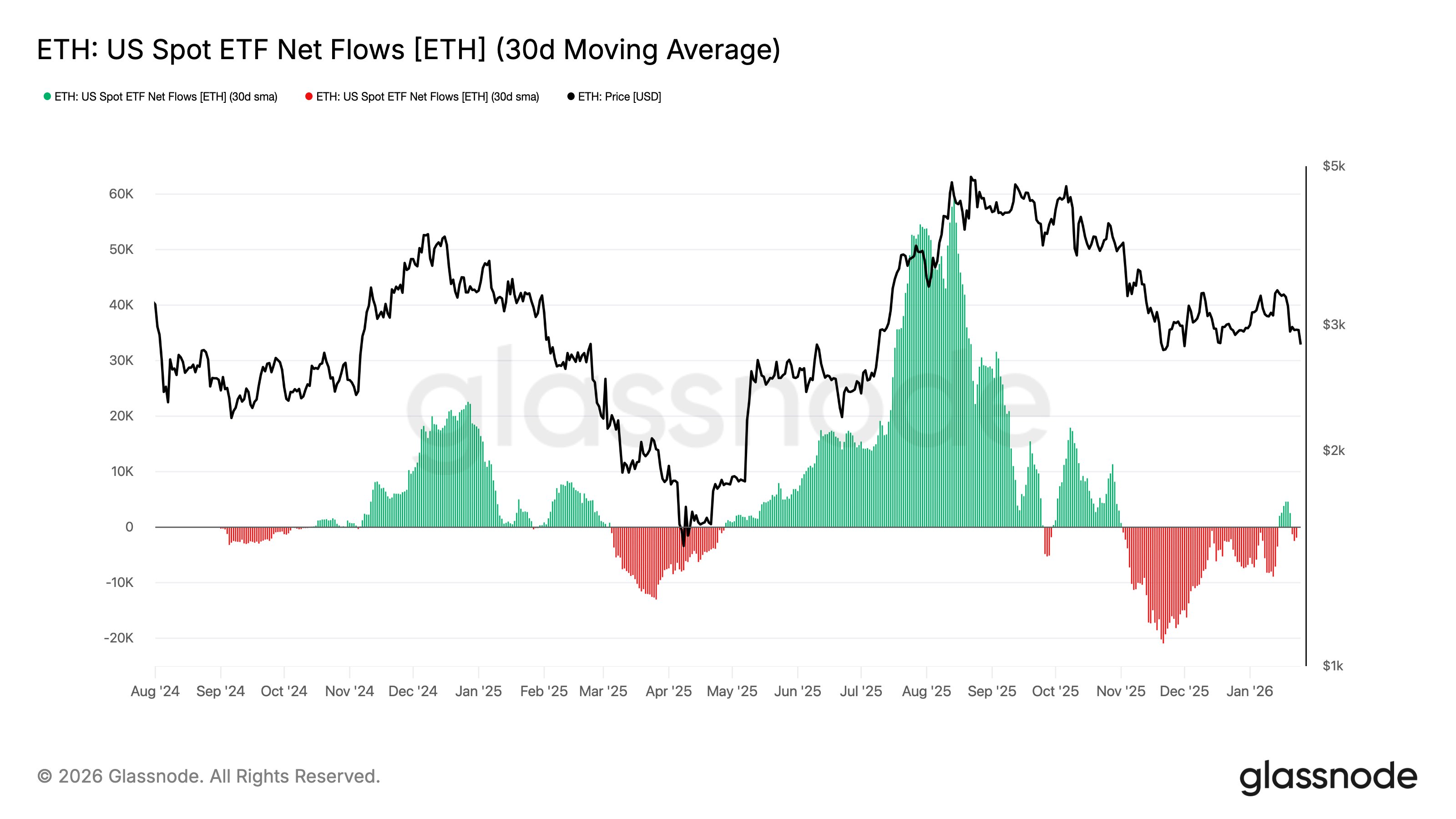 比特币和以太坊现货ETF需求持续疲软,月度平均净流入仍为负值。