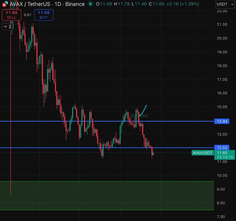 AVAX交易于11-15美元区间下沿,11.40美元为关键支撑,上行目标指向13与15美元。来源:Blacksea via X