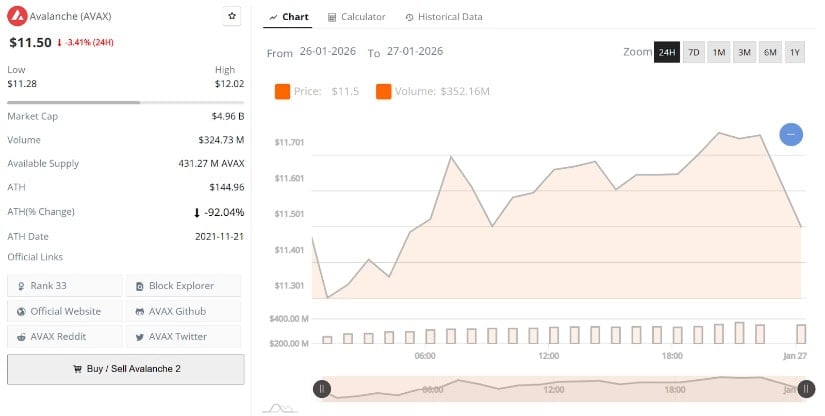 雪崩协议现价11.50美元,24小时下跌3.41%。来源:Brave New Coin