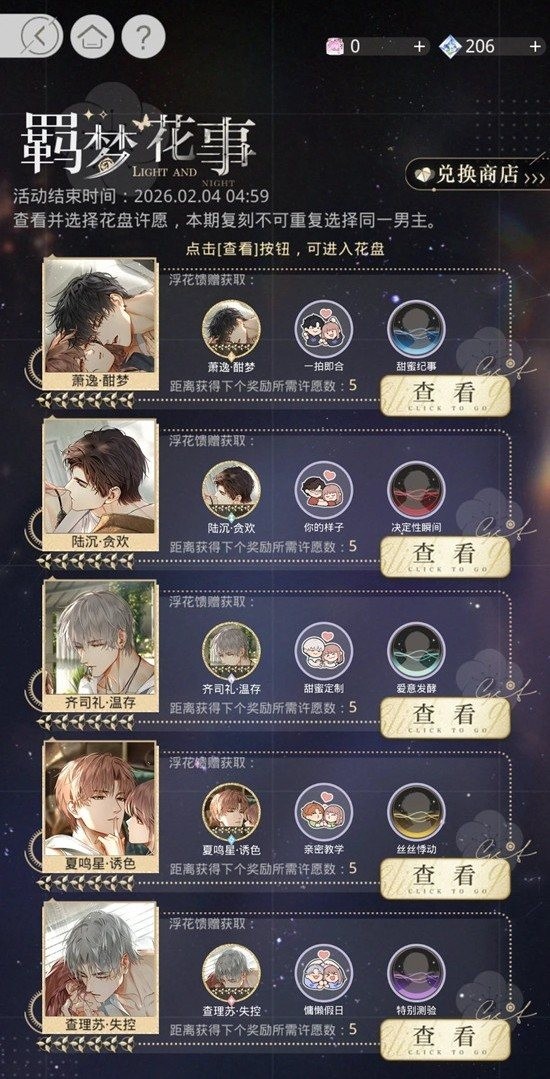 光与夜之恋羁梦花事 [复刻Ⅰ]限时返场将连续开启二期,每期可【自选】一位男主的花盘许愿,选择花盘后,将同步选择对应男主的朝花夕饰 [复刻Ⅰ]活动。那么这一获得礼盒应该怎么买呢?为你准备了一份攻略,一起来看看吧~