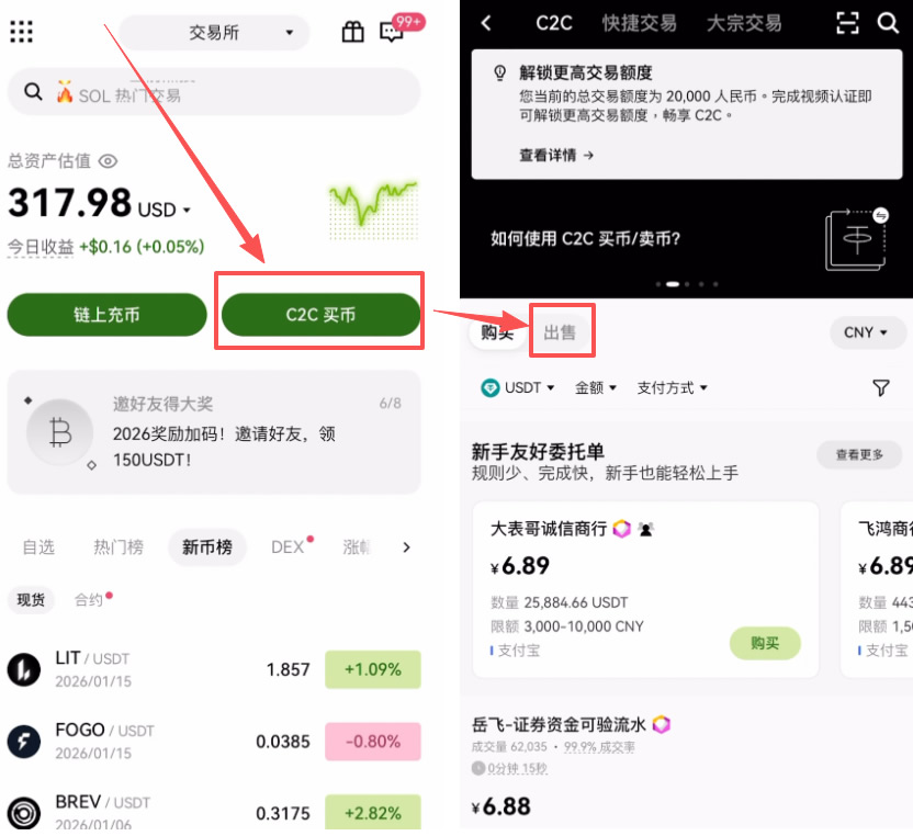 打开欧易APP(官方注册 官方下载),在首页点击“C2C买币”。进入交易页面后,默认通常是“购买”界面,我们需要点击顶部的按钮,将模式切换为“出售”。