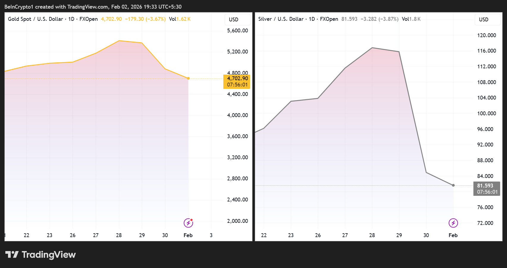 "黄金较高点下跌20%,市值蒸发7.4万亿美元——相当于比特币总市值的5倍。白银暴跌近40%,2.7万亿美元灰飞烟灭——等同于整个加密市场市值。传统避险资产正像加密模因币般剧烈波动",分析师Bull Theory指出。