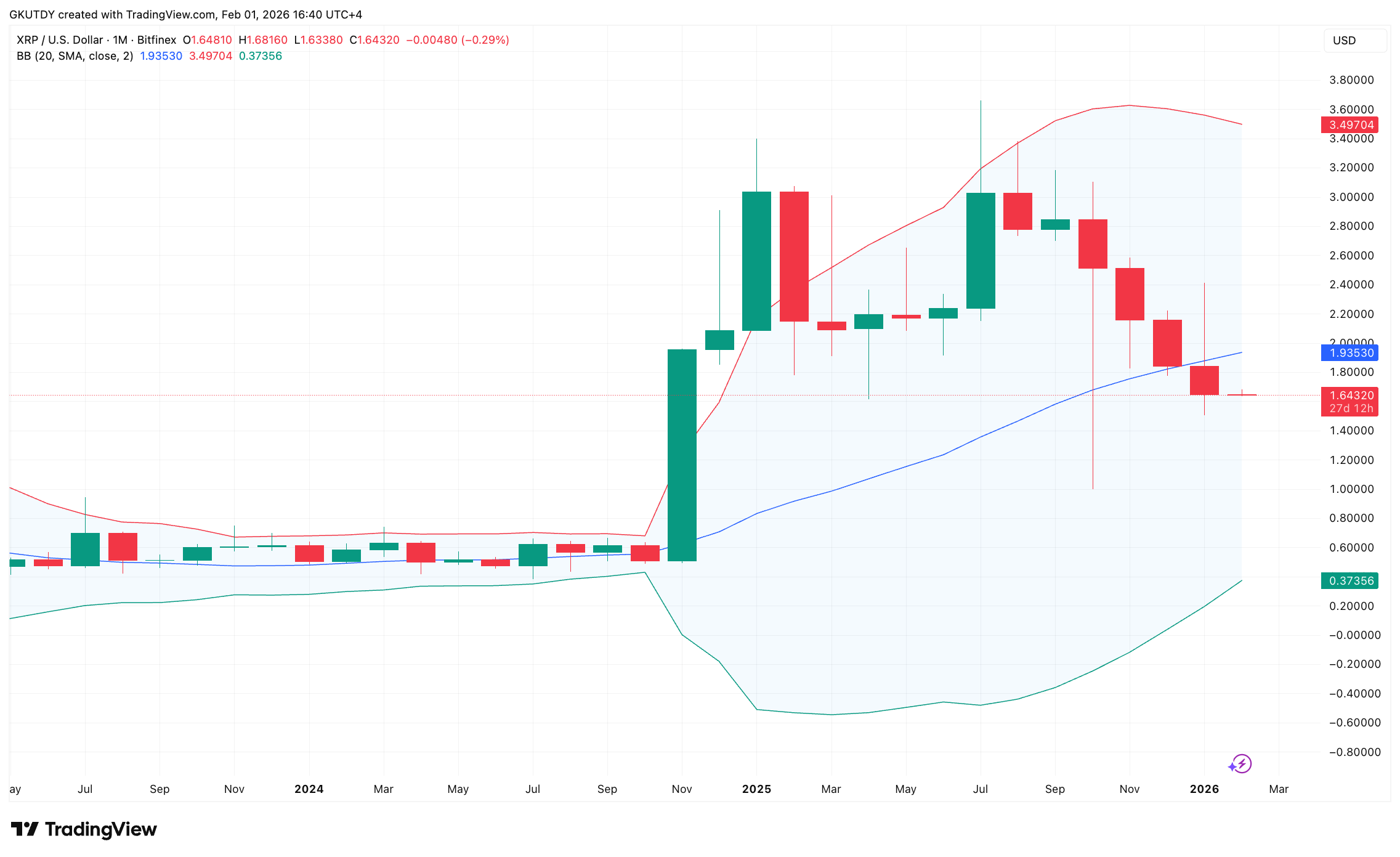 XRP月线图亮起红灯——这是逾一年来首次收盘低于布林中轨。简言之,该水平历来是强弱分界线。