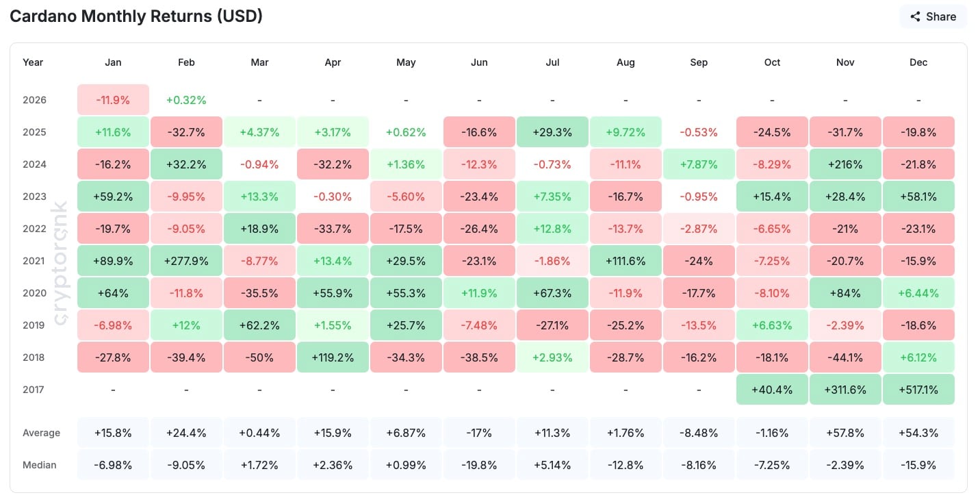 ADA价格动能通常在月末加速。2021、2023、2024年均呈现相似模式:2月上旬横盘或下跌,随后突破上涨。当前格局似在重演。