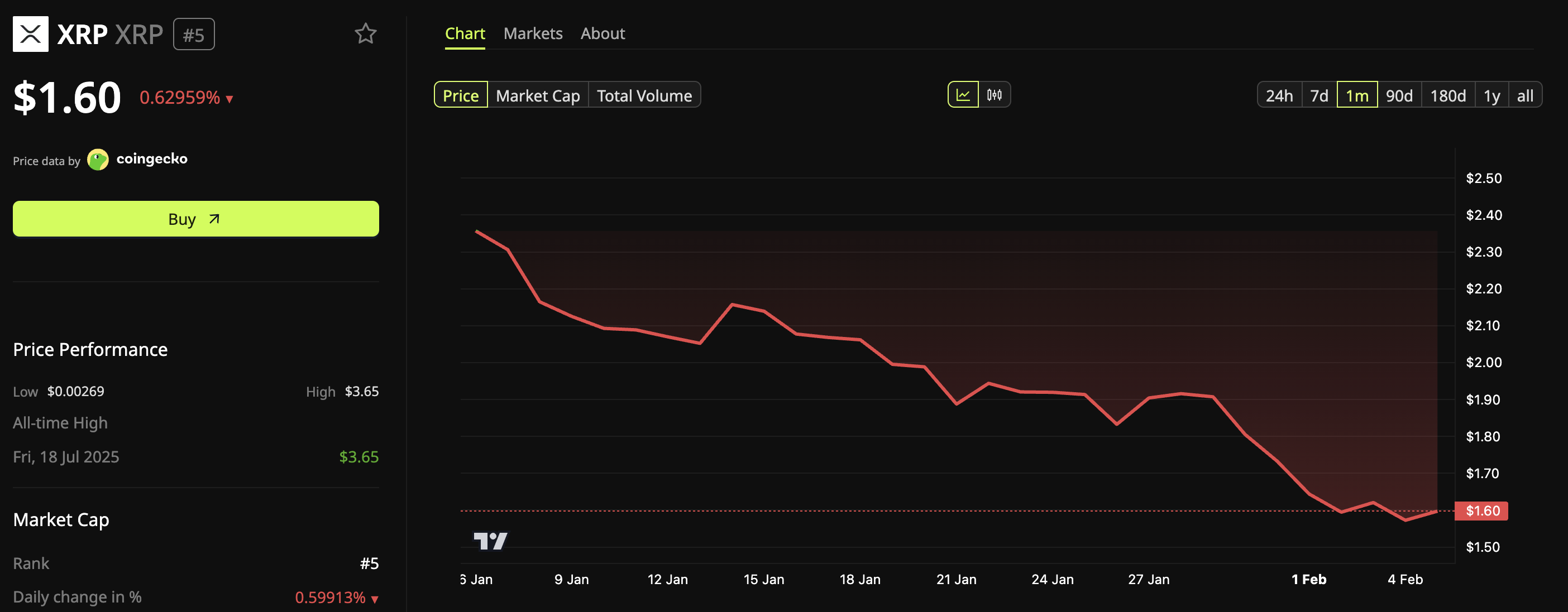在市场整体回调背景下,XRP近七日跌幅达16%。本文撰写时报价1.59美元,24小时下跌0.62%。