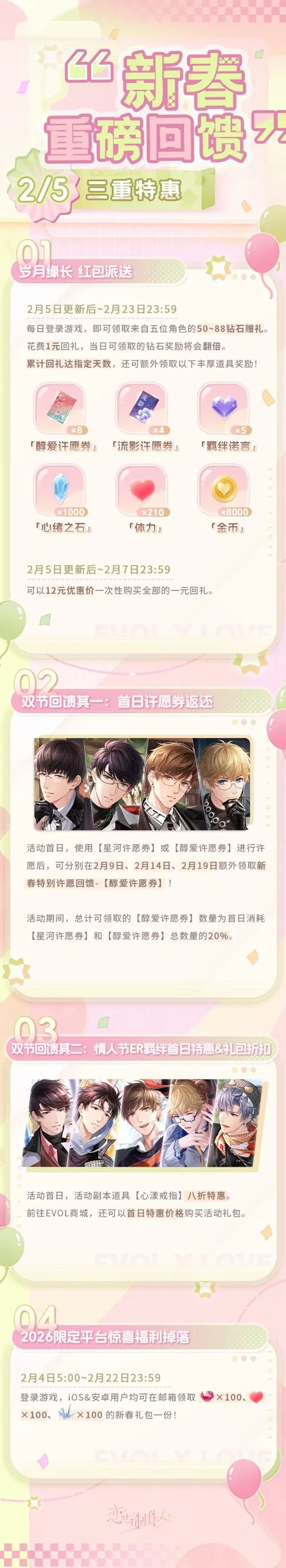 恋与制作人2026新春活动以 “双节同庆” 为核心,2 月 5 日更新后开启,覆盖春节与情人节,核心含 UR 羁绊卡池、免费 R 羁绊、累充福利、登录回礼等,那么新春活动有什么呢?为你准备了一份攻略,一起来看看吧~