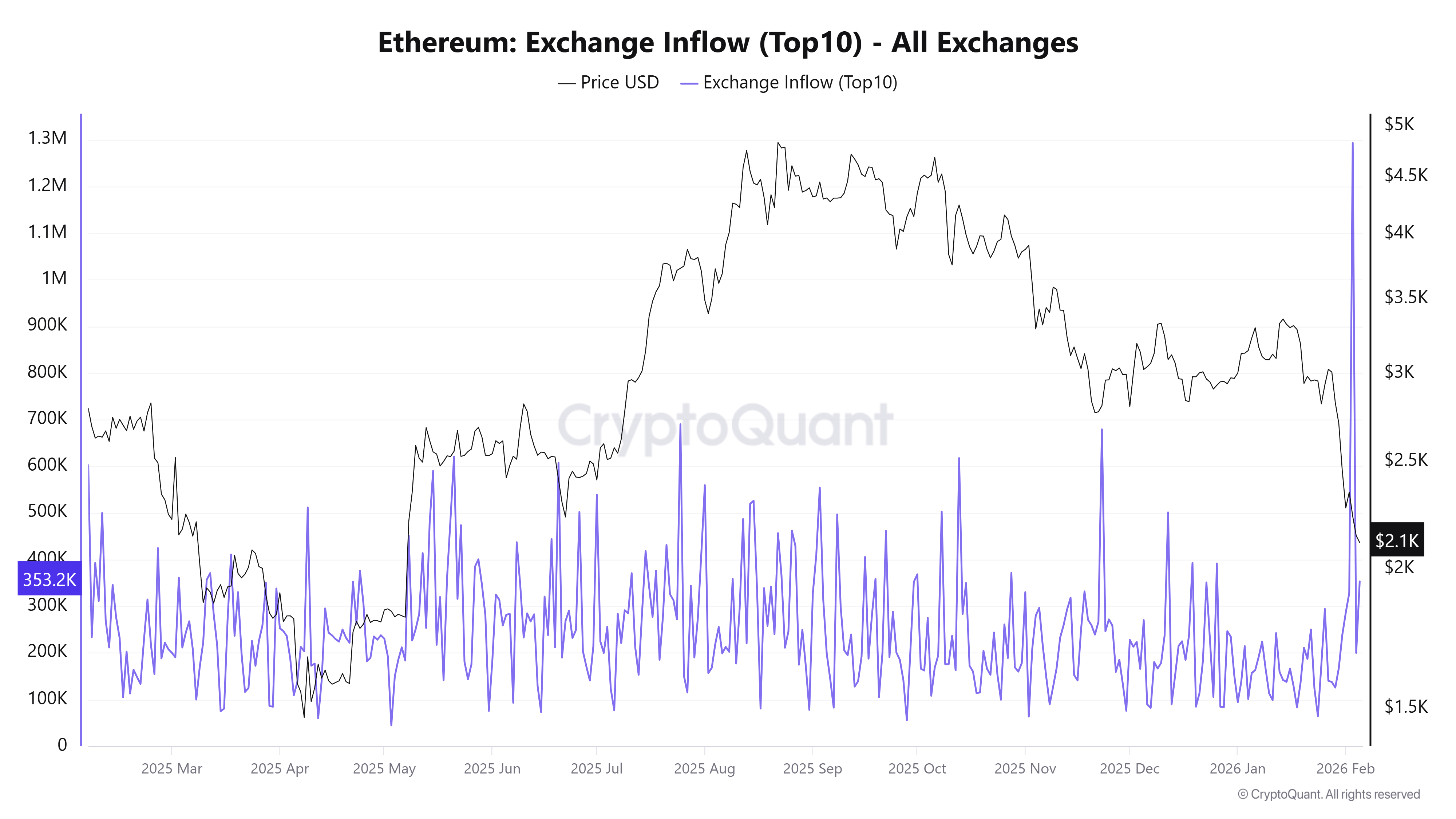 这一观点在二月初得到进一步佐证——当ETH跌破2300美元时,交易所大额流入量(前十)出现飙升。
